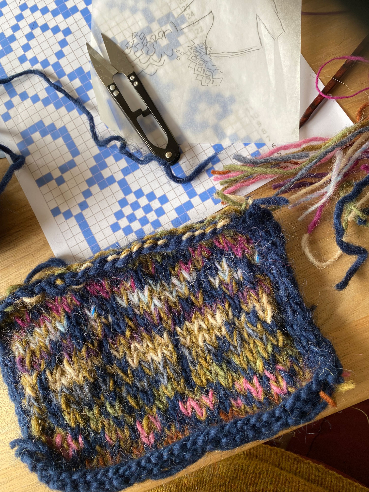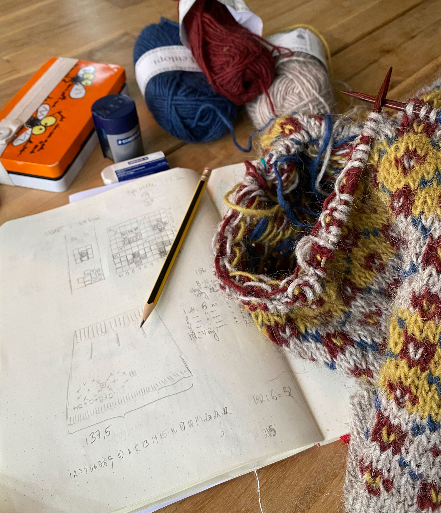 Jeg deler historier fra mit eget strikkeliv – for eksempel min tattoo-kofte, hvor jeg har strikket livets fortællinger ind i masker og farver.